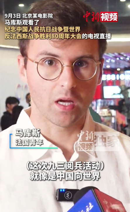 9月3日,法国青年马库斯(Marcus)观看了一场直播电视广播,纪念中国反对日本入侵战争80周年,并在北京电影院中通过4K超高的大型屏幕在北京电影院举行了反法西斯战争。现场直播后,马库斯在接受《中国新闻社》采访时说,整个军事游行都给他留下了深刻的印象,这就像世界上的诺言 - 肯定可以保护和平。 (Xie Longfei,他Lingxiao,视频制作,天娜)